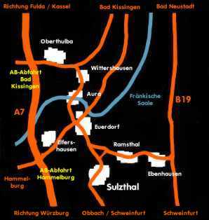 Wer´s auf der Karte sucht: Der Markt Sulzthal liegt im Landkreis Bad Kissingen - ca. 40 km nördlich von Würzburg. Die Kreisstadt Bad Kissingen, eine bekannte Kurstadt, liegt nur ein paar Kilometer von Sulzthal entfernt aufwärts an der Fränkischen Saale.